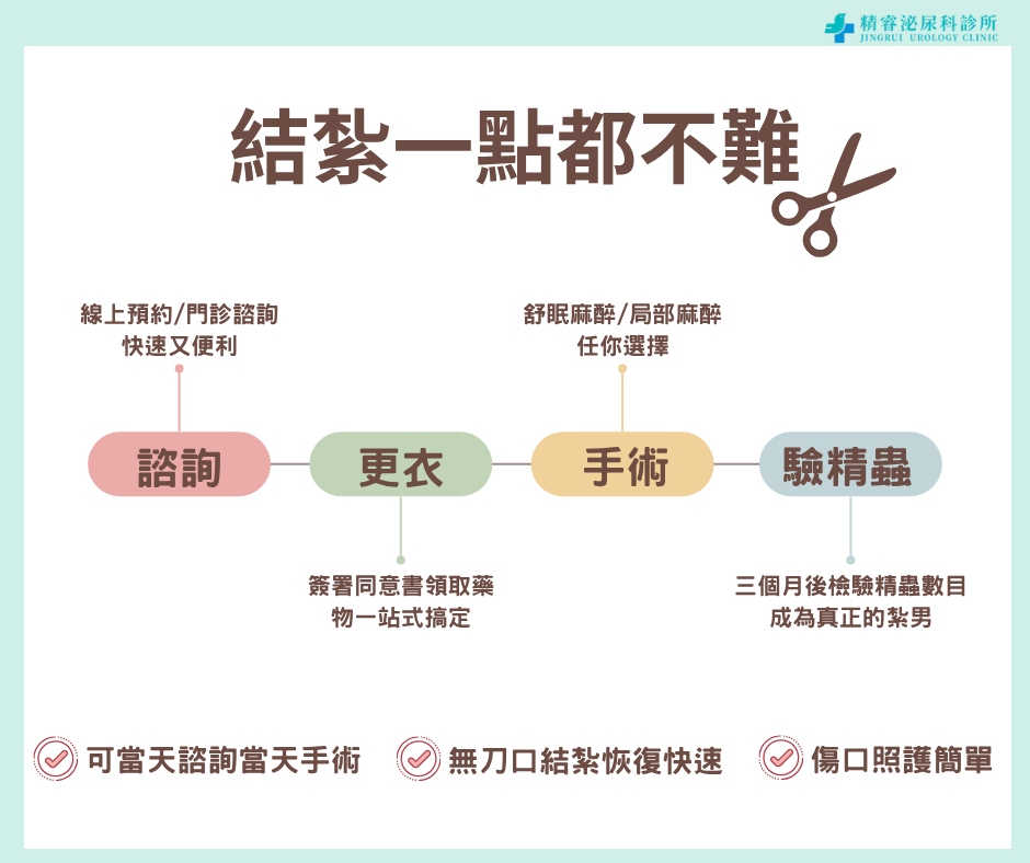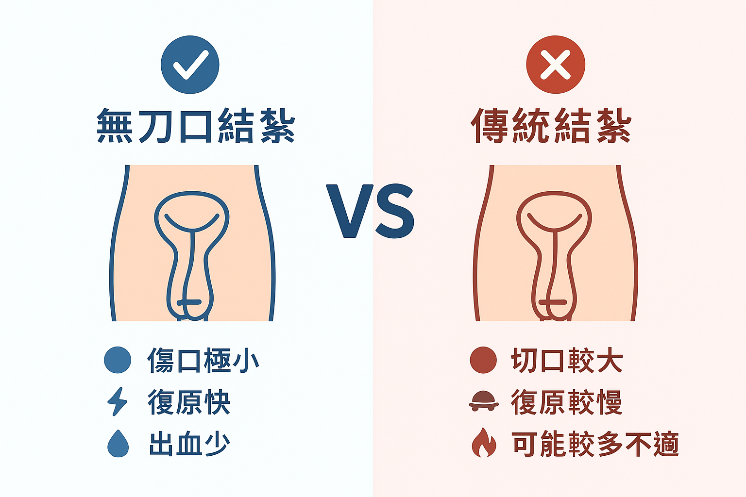 無刀口結紮會在陰囊中央開一個極小的傷口,將輸精管拉出後剪斷並封閉,阻斷精子的通道。手術過程約 15–20 分鐘,傷口極小,復原速度快。