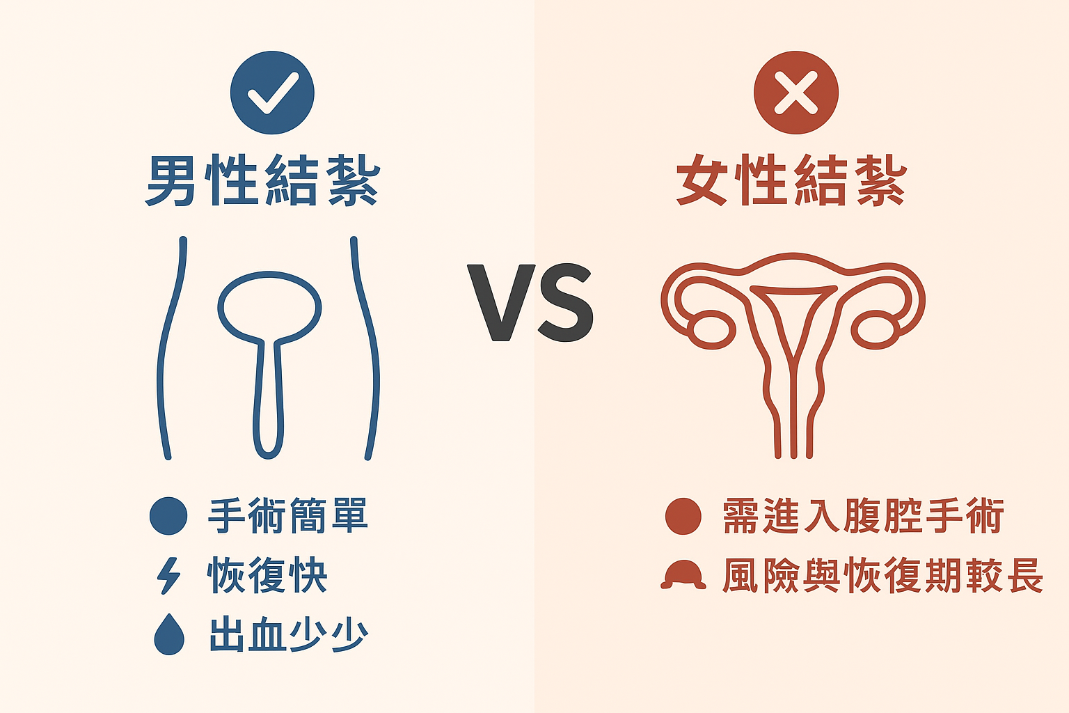 - 女性結紮:需進入腹腔手術,風險與恢復期較長