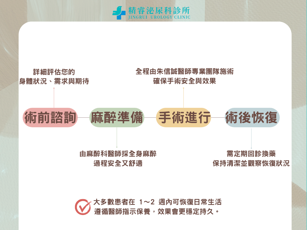 讓泌尿專科醫師詳細了解您的需求、健康狀況與期望效果。 - 手術設計與材質選擇